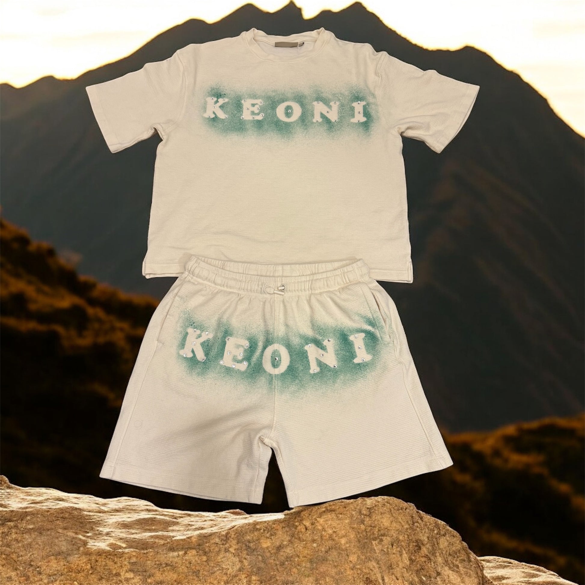 Step into elevated minimalism with effortless edge. The Keoni Halo Drift Set features a hand-crafted spray aura design, creating a soft halo effect around the bold KEONI lettering. Each piece is individually detailed, giving it a one-of-a-kind finish that feels raw, artistic, and powerful.